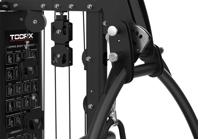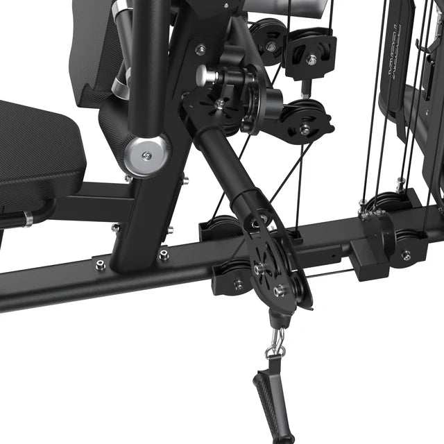 Accessoires inclus : 2 poignées de traction, chaîne, 4 crochets, barre latérale, barre à triceps, poids aux chevilles, corde à double triceps, bras de câble gratuits