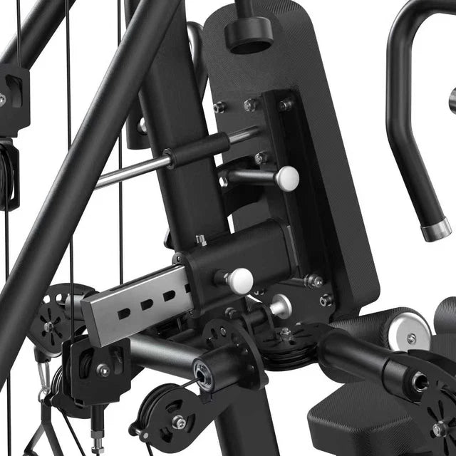 Station d'entraînement professionnelle avec une colonne de poids de 105 kg entièrement protégée, permettant des entraînements complets du haut et du bas du corps. Cadre robuste en acier tubulaire, câbles gainés et poulies haute performance, idéale pour les salles de sport et les usages professionnels intensifs.