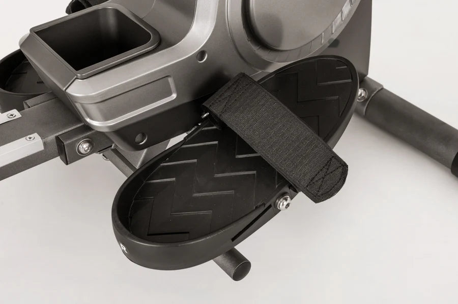Rameur compact et moderne, idéal pour les entraînements à domicile. Équipé d' un système de freinage magnétique avec réglage électronique de l'effort sur 16 niveaux , d'un volant d'inertie de 5 kg, d'un cardiofréquencemètre sans fil et d'une console LCD rétroéclairée bleu. Il comprend un support pour smartphone, 10 programmes prédéfinis, 4 HCR et 5 profils utilisateur. Le système pliable est compact et compatible avec l' application fitness Kinomap (abonnement non inclus) via Bluetooth intégré.