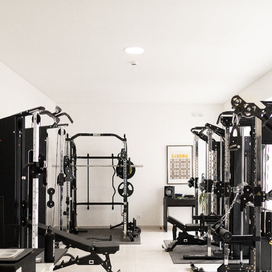 Dupla polia & remo • Lat machine • Smith • Rack funcional — num footprint compacto que fecha para poupar espaço.